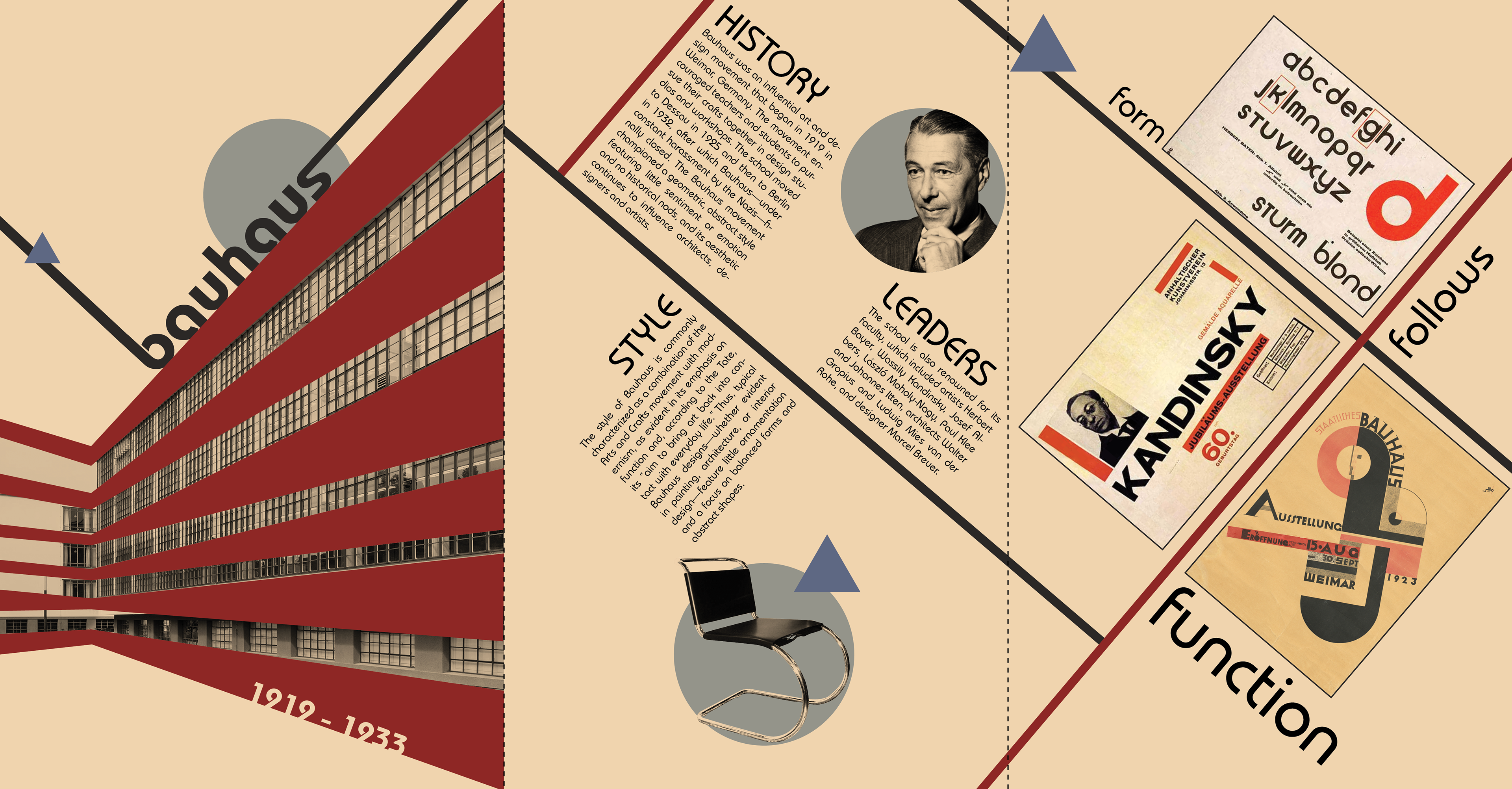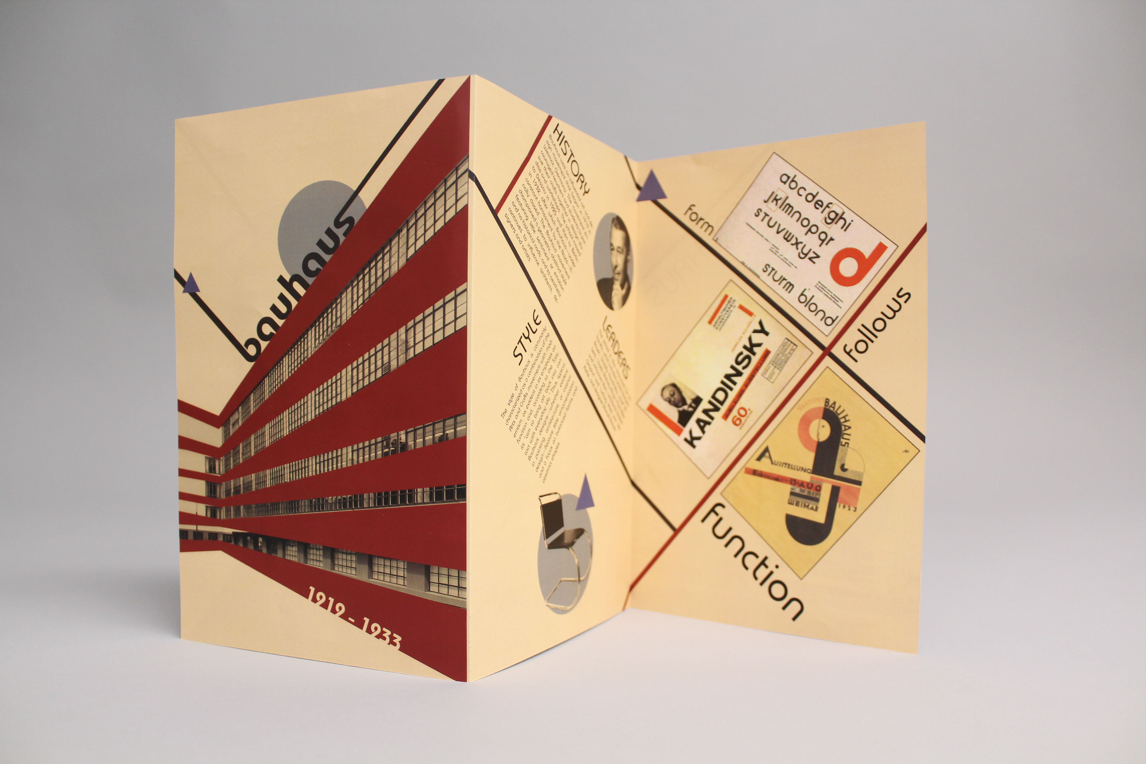 A tri-fold brochure about the Bauhaus design movement and its contribution to modernism, incorporating the design elements and style of the movement by referencing typefaces, asymmetrical balance, contrast of elements, geometric shapes, pattern, etc.